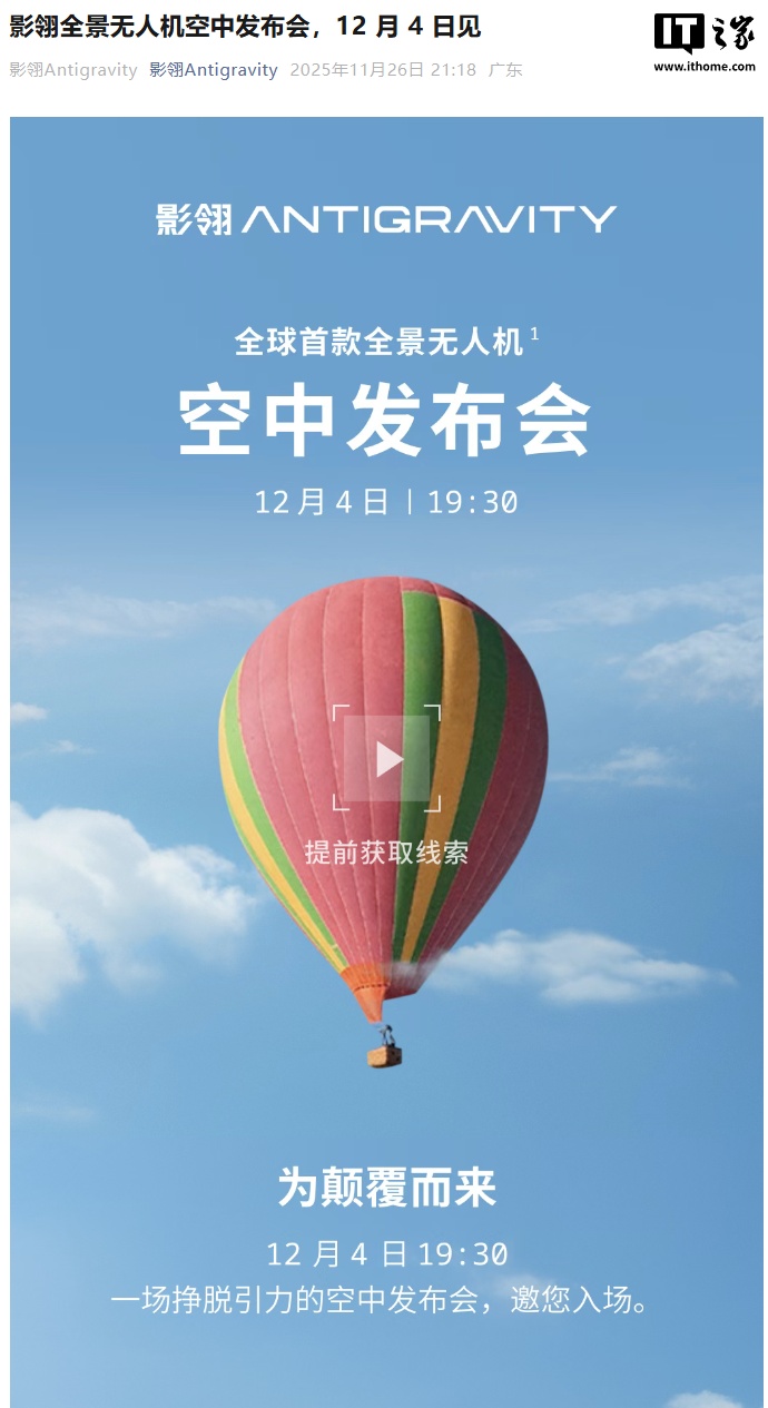 IT之家 11 月 27 日消息,影石影翎 Antigravity 昨晚宣布,全球首款全景无人机空中发布会将于 12 月 4 日 19:30 举行。