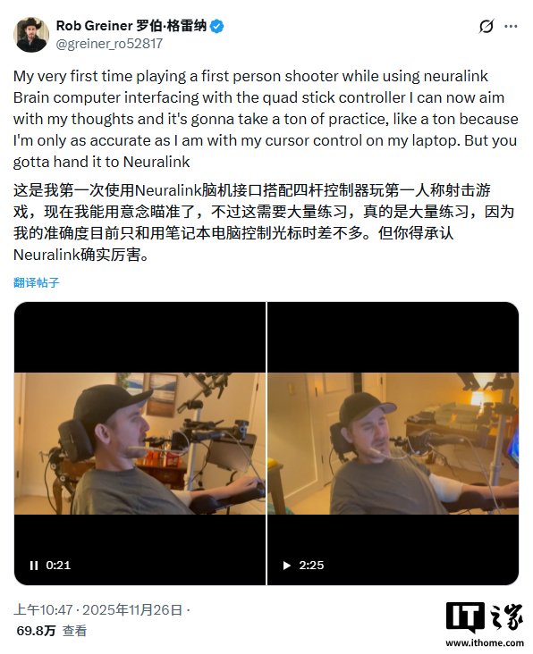 IT之家 11 月 30 日消息,一名瘫痪男子表示,他现在可以借助 Neuralink 脑机接口植入设备玩《战地 6》(Battlefield 6)等第一人称射击游戏。