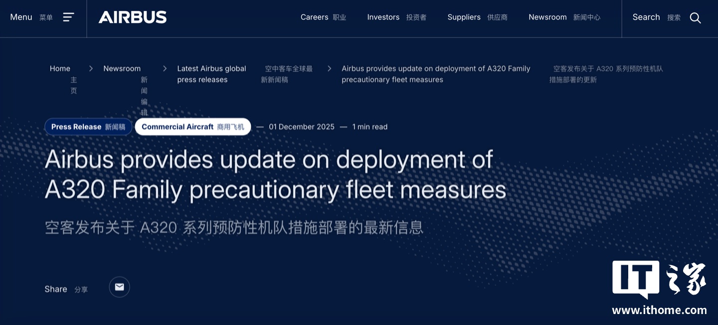 IT之家从官方声明获悉,空客对本次事件给旅客与航空公司造成的各种挑战与延误表示歉意。公司向所有航空公司、相关监管机构、员工及其他利益相关方表示感谢,感谢他们在落实这些措施中的支持,以及对空客“将安全置于一切之上”这一决定的理解。