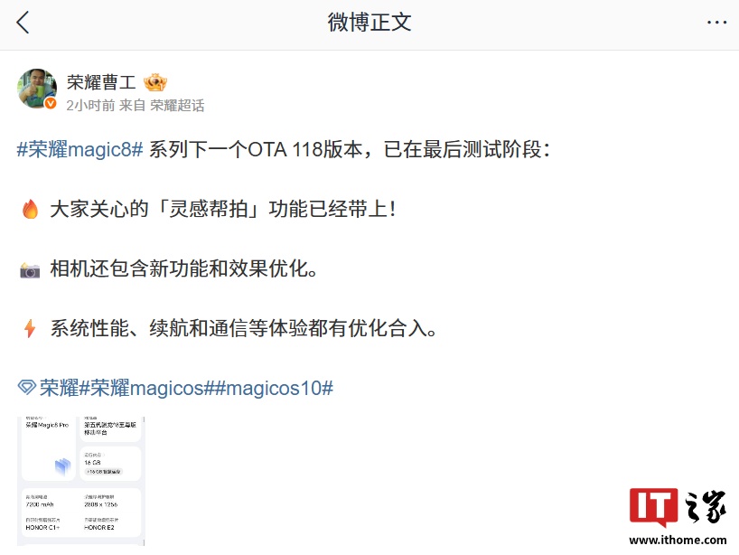 IT之家 12 月 1 日消息,据荣耀研发工程师 @荣耀曹工 今日分享,Magic8 系列手机下一个 OTA 118 版本已在最后测试阶段,将支持「灵感帮拍」功能。