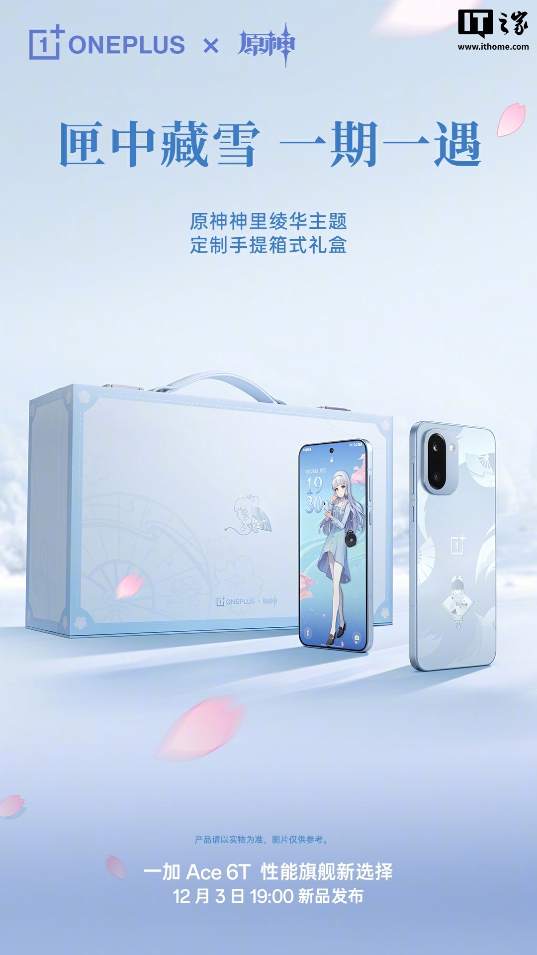 IT之家 12 月 2 日消息,在公布一加 Ace 6T 原神神里绫华定制机后,一加手机官方还揭晓了该款联名手机的旅行手提箱式设计礼盒的外观、专属珍藏配件内容等。