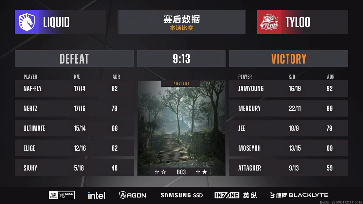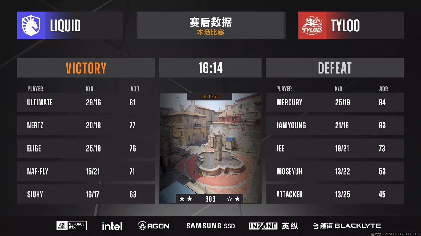 TYLOO 在与 Liquid 的对决中首先以 13:9 的比分拿到远古遗迹 (ancient) 的胜利;但很快在自己的选图列车停放站 (train) 上被 Liquid 以 13:5 扳回一城;而到了决胜地图炼狱小镇 (inferno),尽管 TYLOO 率先拿到四个赛点但还是被 Liquid 拖入加时,最终 14:16 输掉比赛。