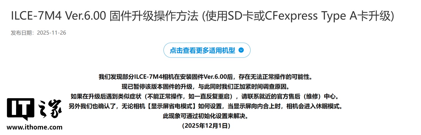 IT之家 12 月 2 日消息,索尼官方昨天在官网发布声明称,部分 Alpha 7 IV(ILCE-7M4)相机在安装 Ver.6.00 固件后,存在无法正常操作的可能性。