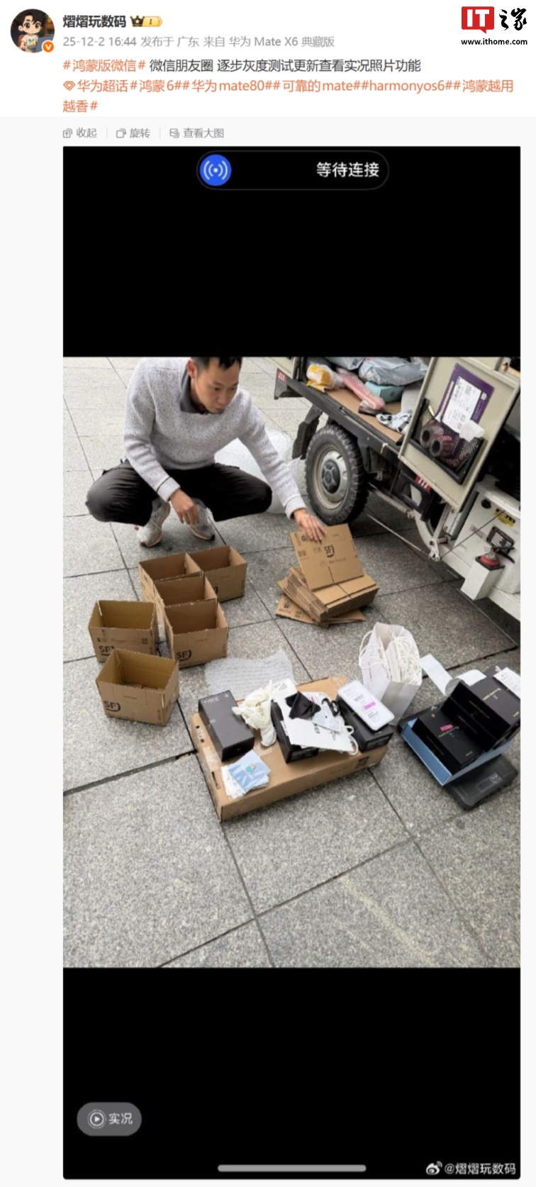 目前,实况照片功能正逐步覆盖鸿蒙HarmonyOS NEXT 系统。据博主 @熠熠玩数码 今日分享,微信鸿蒙版 App 微信朋友圈逐步灰度测试更新查看实况照片功能。