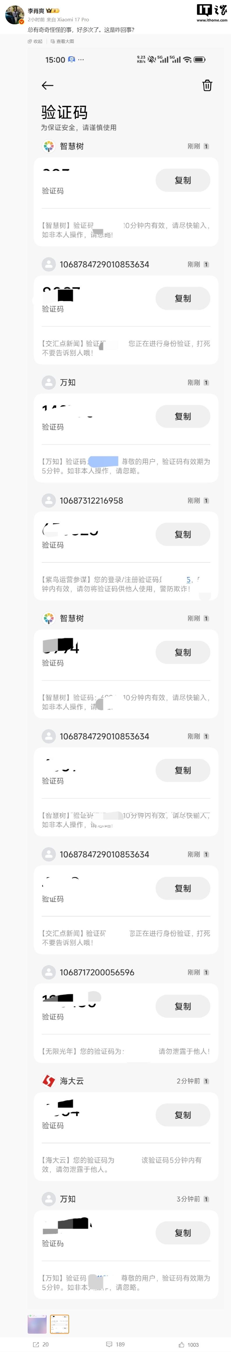 IT之家注意到,小米汽车副总裁李肖爽今日也在微博分享截图表示收到了短信验证码轰炸:总有奇奇怪怪的事,好多次了。这是咋回事?
