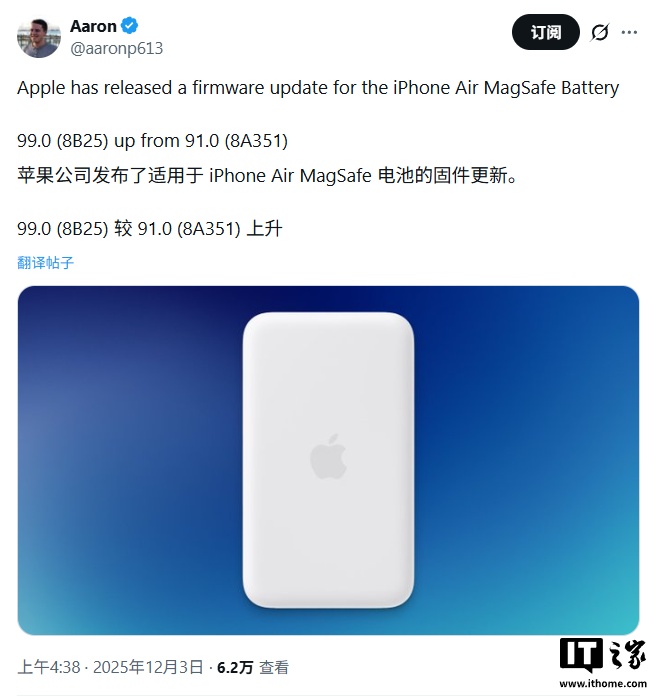 IT之家 12 月 3 日消息,科技媒体 MacRumors 昨日(12 月 2 日)发布博文,报道称针对 iPhone Air 专用 MagSafe 电池配件,苹果推送版本号为 8B25 的全新固件,在系统设置中显示为 99.0,相较于此前的 91.0(版本号 8A351)有所升级。