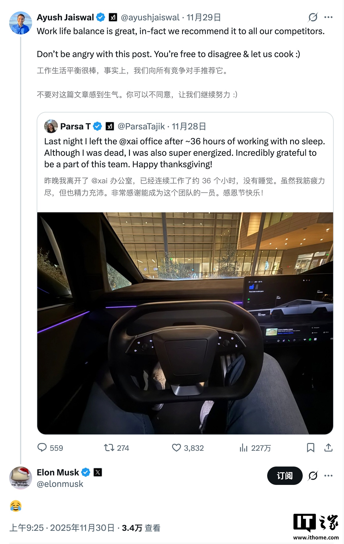 xAI 另一名员工 Ayush Jaiswal 转发并打趣称,“工作与生活平衡是很好,我们在此建议竞争对手也这样做。别生气,放我们一马,让我们干吧。”马斯克以笑哭表情回应。