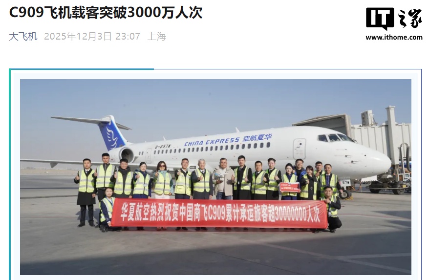 IT之家 12 月 3 日消息,中国商飞公司“大飞机”公众号官宣,12 月 3 日,在喀什飞往伊宁的华夏航空 G54969 航班上,C909 飞机迎来了第 3000 万名乘客。