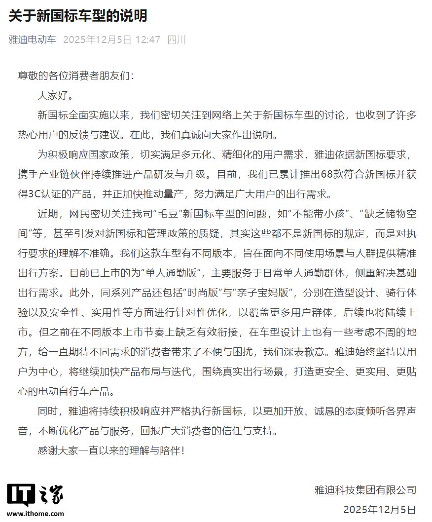 近期,网民密切关注我司“毛豆”新国标车型的问题,如“不能带小孩”、“缺乏储物空间”等,甚至引发对新国标和管理政策的质疑,其实这些都不是新国标的规定,而是对执行要求的理解不准确。我们这款车型有不同版本,旨在面向不同使用场景与人群提供精准出行方案。目前已上市的为“单人通勤版”,主要服务于日常单人通勤群体,侧重解决基础出行需求。此外,同系列产品还包括“时尚版”与“亲子宝妈版”,分别在造型设计、骑行体验以及安全性、实用性等方面进行针对性优化,以覆盖更多用户群体,后续也将陆续上市。但之前在不同版本上市节奏上缺乏有效衔接,在车型设计上也有一些考虑不周的地方,给一直期待不同需求的消费者带来了不便与困扰,我们深表歉意。雅迪始终坚持以用户为中心,将继续加快产品布局与迭代,围绕真实出行场景,打造更安全、更实用、更贴心的电动自行车产品。