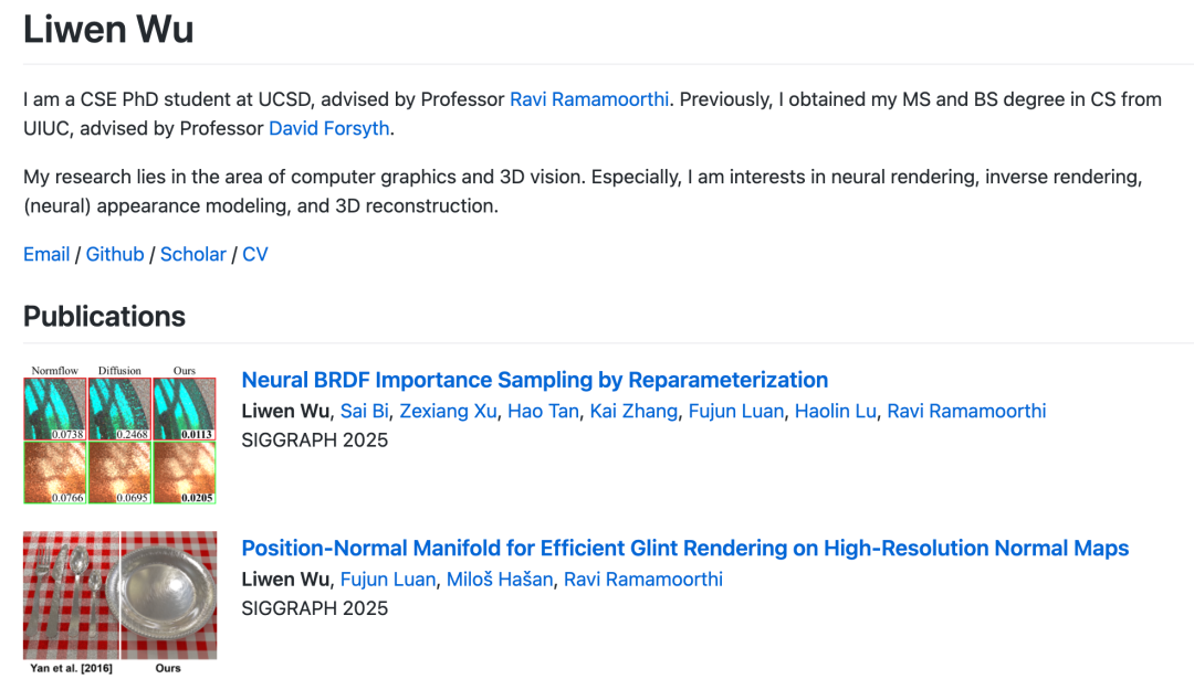Liwen Wu 是 UCSD 计算机科学与工程系的博士生,导师是 Ravi Ramamoorthi 教授。他的主要研究兴趣集中在计算机图形学和 3D 视觉的交叉领域,特别是神经渲染、反向渲染和材质建模。他致力于通过结合神经技术与物理渲染原理,提升渲染的真实感与计算效率,为创建逼真的虚拟世界提供技术支撑。