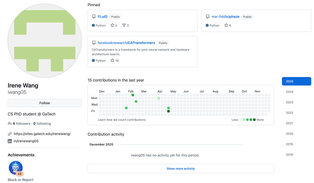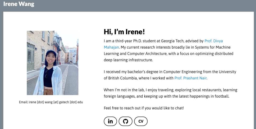 Irene Wang 是佐治亚理工学院的博士生,导师是 Divya Mahajan。她的研究致力于解决大规模 AI 训练中的效率与可持续性问题。她开发了集成加速器架构、网络拓扑与运行时调度的协同设计框架(Co-design Frameworks),旨在优化分布式深度学习系统的性能和能效,推动绿色 AI 计算的发展。