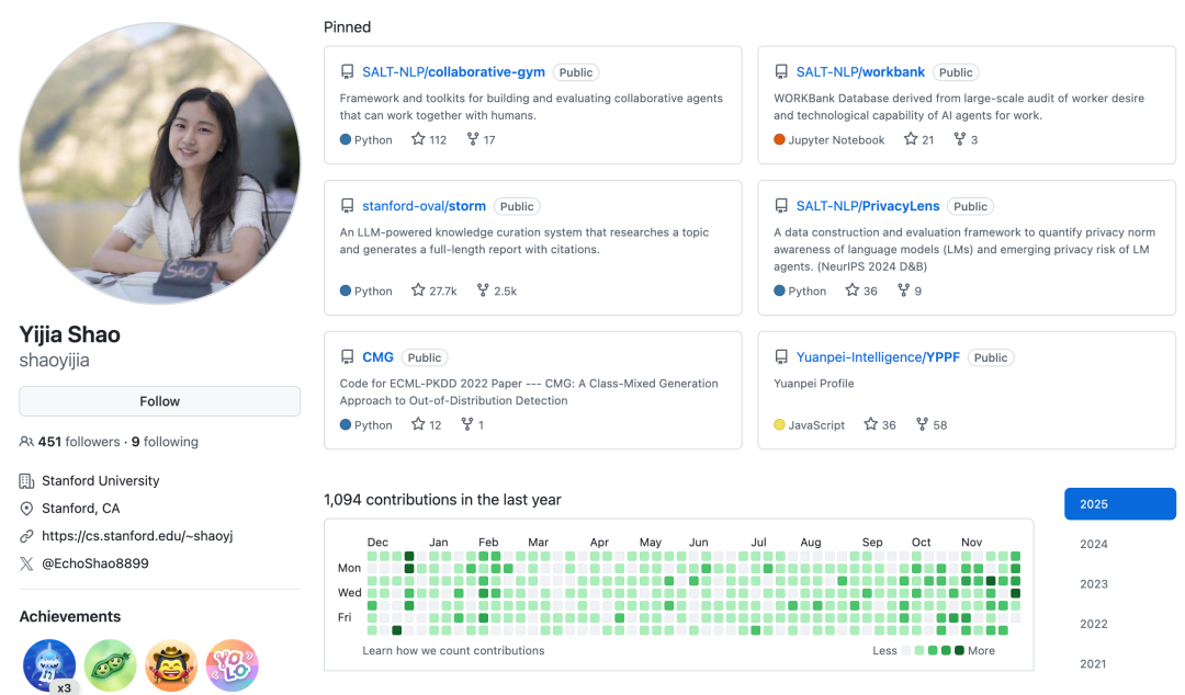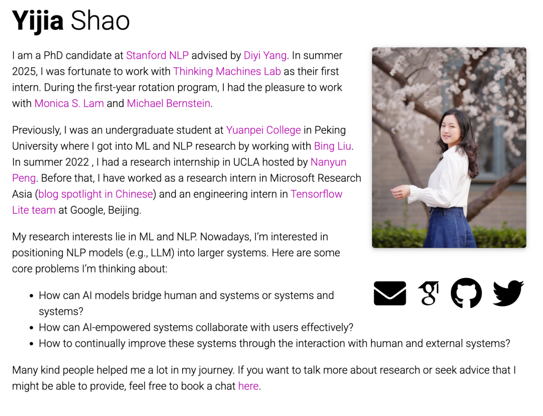 Yijia Shao 是斯坦福大学的博士生,师从 Diyi Yang 教授。她的研究重点是人机协同(Human-AI Collaboration)。她致力于开发能够在任务执行过程中与人类进行有效沟通和协作的 AI 智能体,并设计新型的人机交互界面。她的工作旨在探索 AI 如何通过理解人类意图和反馈,更好地辅助人类完成复杂的知识密集型任务。