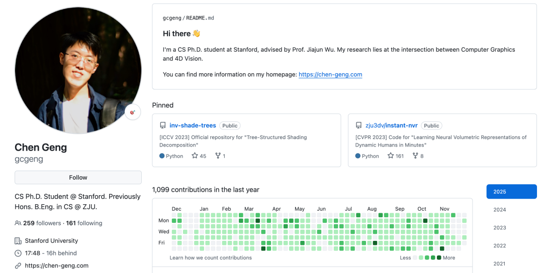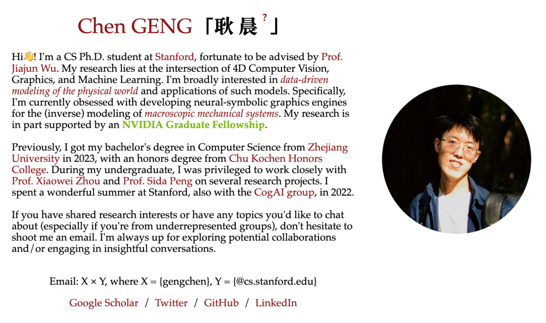 Chen Geng 是斯坦福大学的博士生,导师是 Jiajun Wu。他的研究兴趣位于计算机图形学与 4D 视觉的交叉点。他致力于利用可扩展的数据驱动算法和物理启发原理,对四维物理世界进行建模。他的工作推进了面向机器人与科学应用的物理基础三维与四维世界模型(World Models),特别是在动态场景的生成与理解方面。
