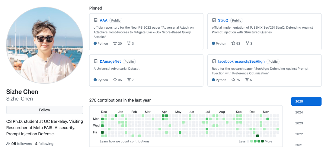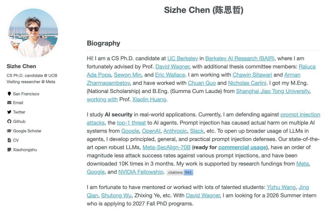 Sizhe Chen 致力于人工智能安全领域的研究,重点关注现实场景中的模型防御机制。他目前的研究聚焦于大语言模型(LLM)和智能体(Agents)的安全性,特别是如何通过通用且实用的防御手段(如结构化查询防御)来保护智能体免受提示注入等攻击,同时确保智能体在执行任务时的功能完整性。