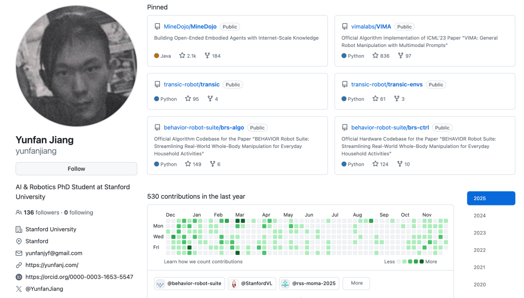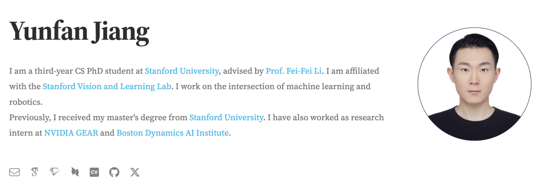 Yunfan Jiang 是斯坦福大学计算机科学系的博士生,导师是李飞飞(Fei-Fei Li)教授。他的研究目标是构建通用的机器人系统,使其能够执行复杂的日常任务。他通过融合现实世界的全身操控数据、大规模仿真环境(如 Minecraft)以及互联网级的多模态监督数据,开发可扩展的方法来训练具备高度适应性的机器人智能体。
