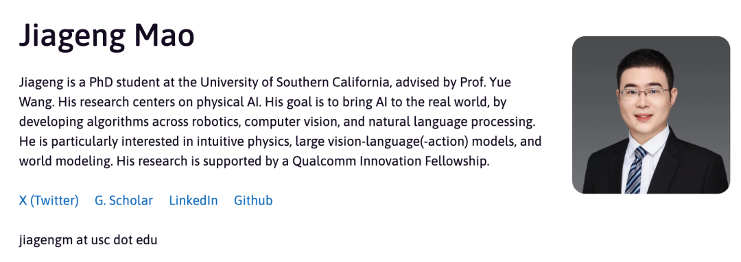 Jiageng Mao 是南加州大学的博士生,师从 Yue Wang 教授。他的研究核心在于物理人工智能(Physical AI),致力于通过利用互联网规模数据中的多样化先验知识,解决复杂的物理世界问题。他的目标是为现实世界中的具身智能体(Embodied Agents)开发稳健且可泛化的智能系统,研究涵盖了自动驾驶、计算机视觉和机器人学习等前沿领域。