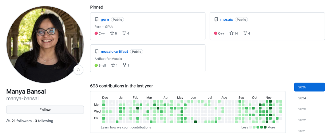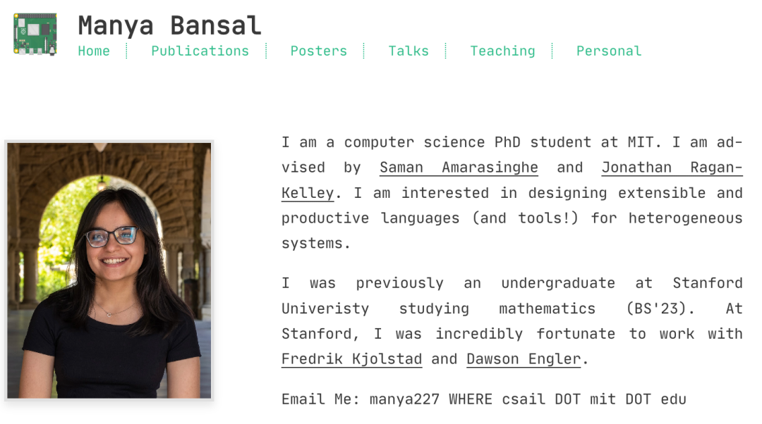 Manya Bansal 是 MIT 的博士生,由 Saman Amarasinghe 和 Jonathan Ragan-Kelley 指导。她的研究致力于为现代硬件加速器设计新型编程语言和编译器。她开发的系统允许开发者编写模块化、可复用的高性能代码,旨在解决异构计算系统中的编程复杂性,同时保留对底层硬件的精细控制能力,以实现峰值性能。