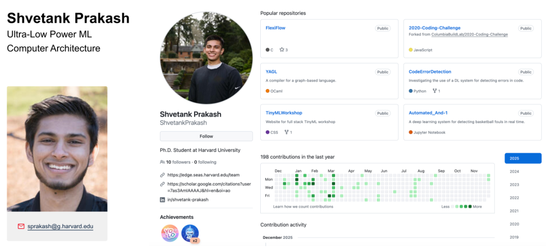 Shvetank Prakash 是哈佛大学的博士生,隶属于边缘计算实验室(Edge Computing Lab)。他的研究专注于为 AI 智能体构建优化的基础设施,特别是针对资源受限的边缘设备。他通过利用新型算法、精选数据集和「智能体优先」的设计理念,推进硬件架构与系统设计,使 AI 能够更高效地部署在下一代计算平台上。