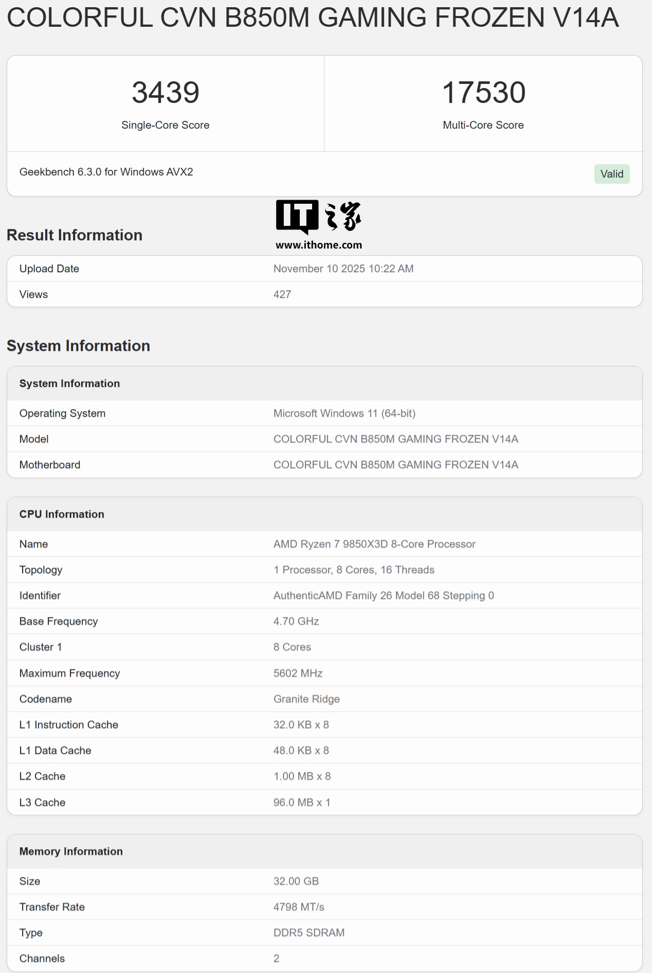 该媒体指出跑分库目前存在 2 个版本,在搭配七彩虹(Colorful)B850M 主板的测试中,Ryzen 7 9850X3D 加速时钟频率为 5602 MHz,取得了单核 3439 分、多核 17530 分的成绩。IT之家附上相关图片如下: