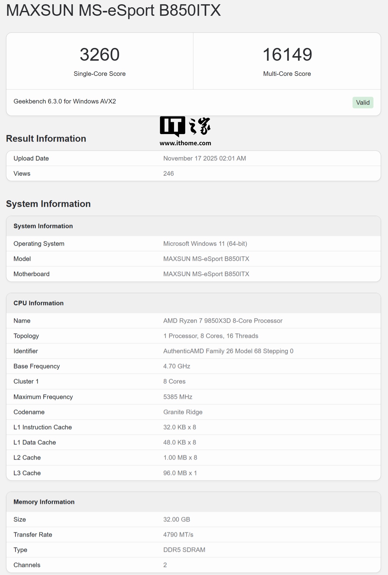 而在铭瑄(Maxsun)B850ITX 主板上,加速时钟频率为 5385 MHz,得分为单核 3260 分、多核 16149 分。