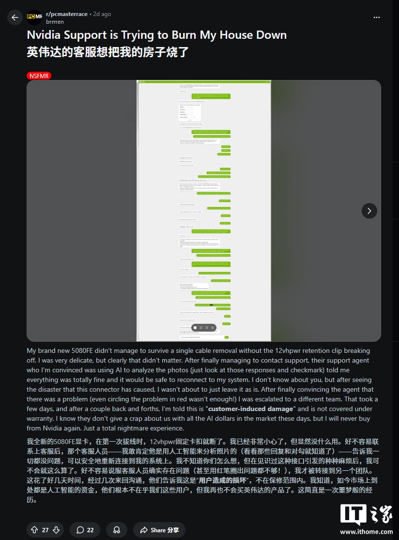 这则帖子发布于当地时间 12 月 4 日,发布在 PCMR(PC Master Race)Reddit 社区。帖中附有该用户与英伟达客服的沟通记录。据该用户描述,起初客服人员告知该接口“可以安全使用”,但随后案件被升级处理,最终被判定为“客户人为损坏”。