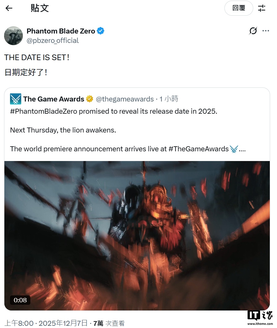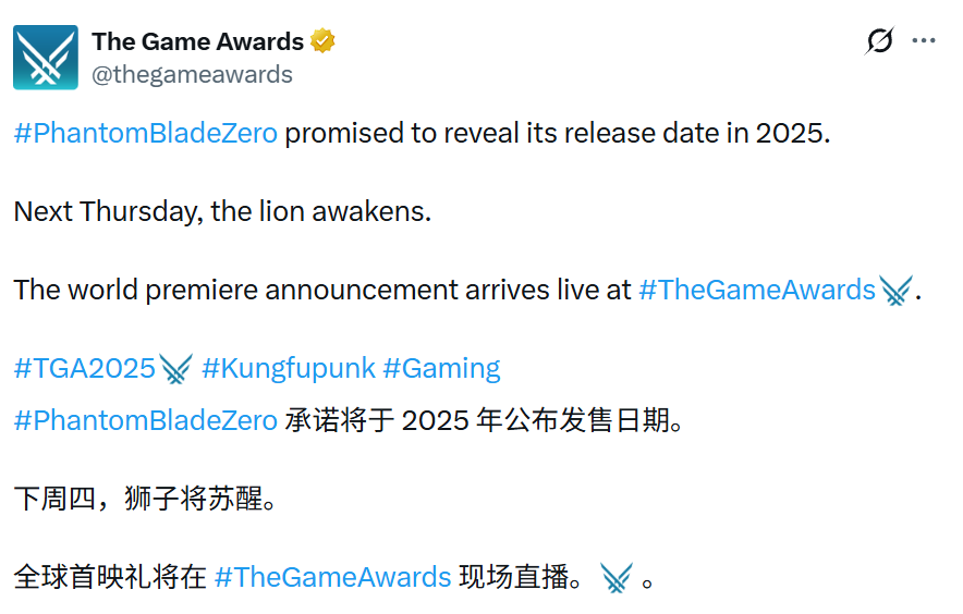 灵游坊首先转发了 TGA 官方发出的一段预热视频,该帖文中以“《影之刃零》承诺 2025 年内公布发售日期、下周四雄狮觉醒”为配文(TGA 2025 将在 12 月 11 日举办,正好是周四),并宣布游戏的发售日期已经定好,只欠正式公布。
