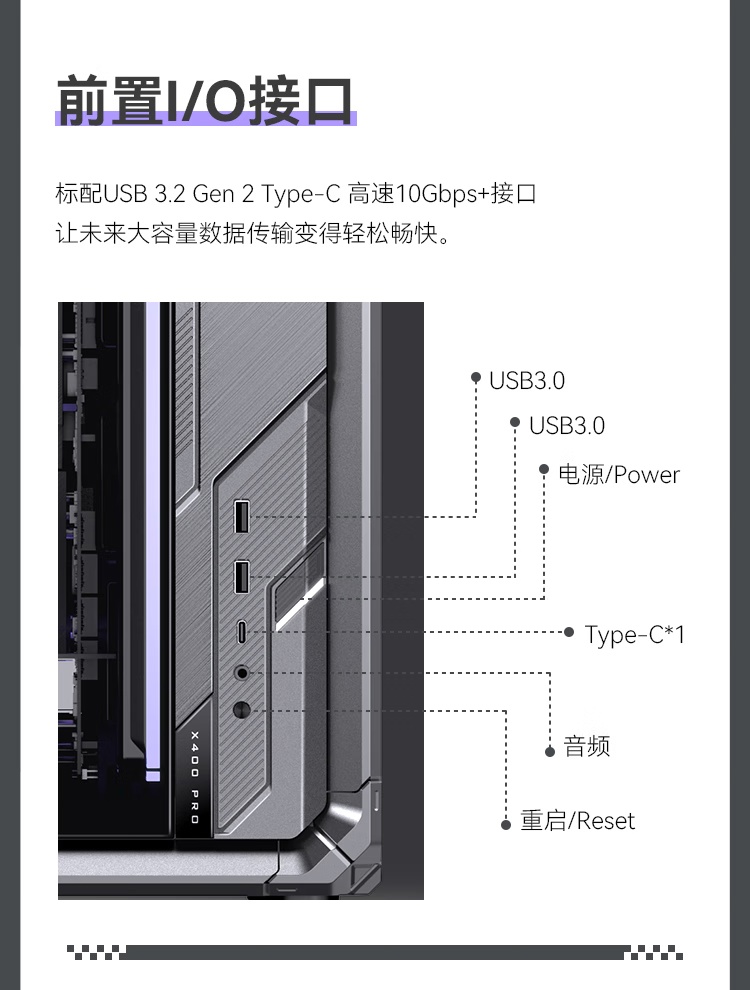 相比于之前上市的乔思伯 X400 基础款,这款机箱将面板 / 外框 ABS 工程塑胶升级为铝合金材质,采用 CNC 铝型材面板、凹面细腻喷砂、平面拉丝阳极工艺。