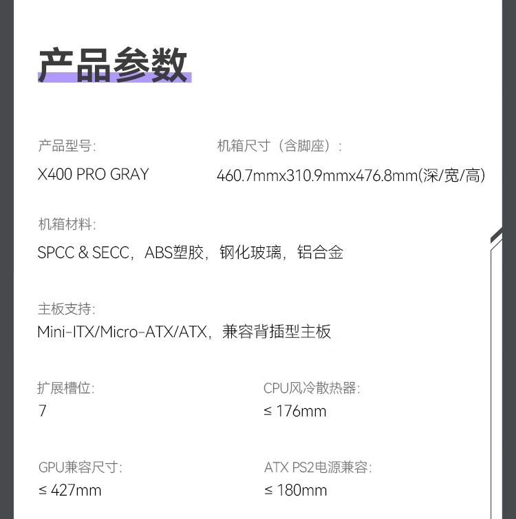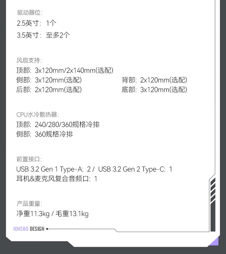 其他方面,这款机箱背线仓配置硬盘支架,可安装两个 3.5 英寸 HDD + 2.5 英寸 SSD(当使用背插主板时,硬盘架仅支持 1 块 3.5 英寸 HDD 硬盘);ATX 电源限长≤180mm,显卡限长 427mm(标配显卡支架,支持显卡竖装)。