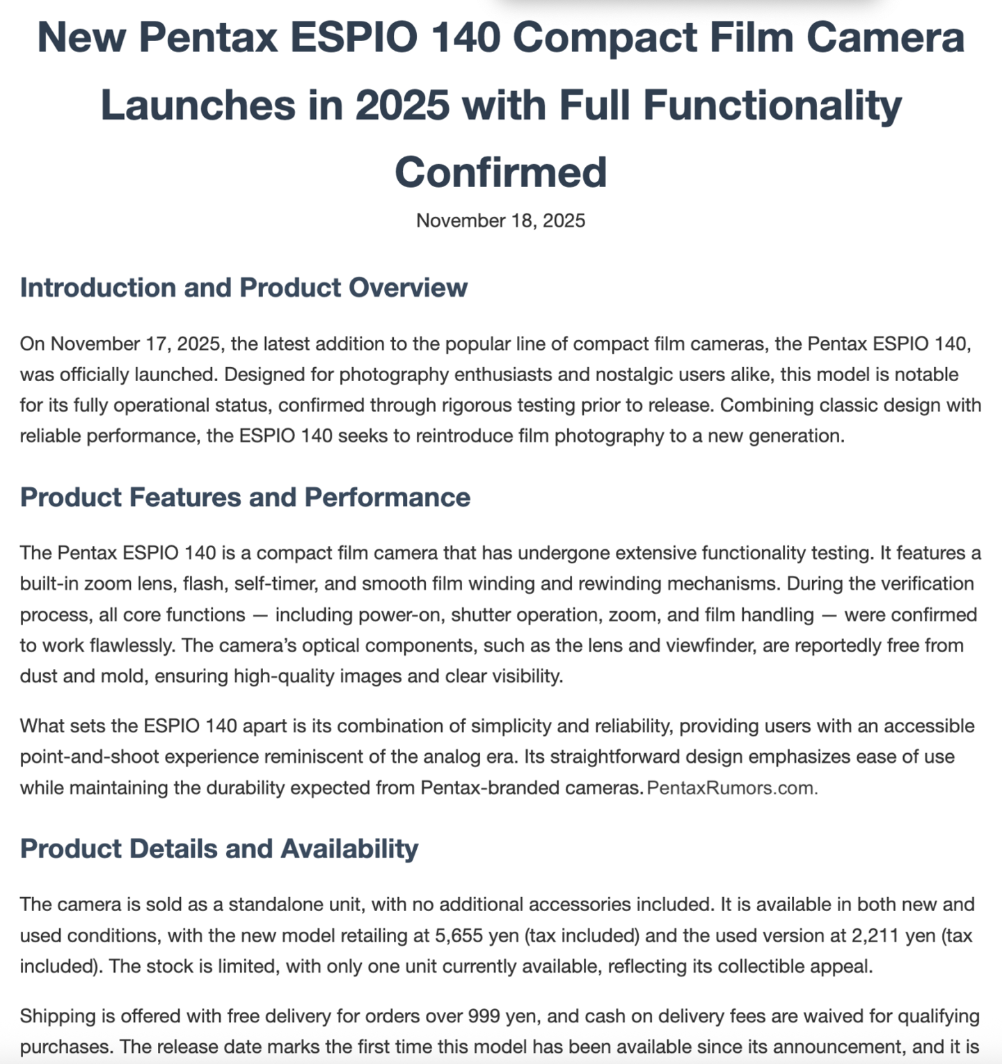 IT之家 12 月 8 日消息,消息源 Pentax Rumors 昨天发布博文,报道称收到了一份来自宾得的新闻稿,显示这家公司有望复刻 20 世纪 90 年代末推出的 ESPIO 140 胶片傻瓜相机。