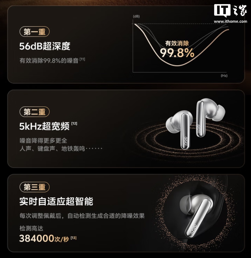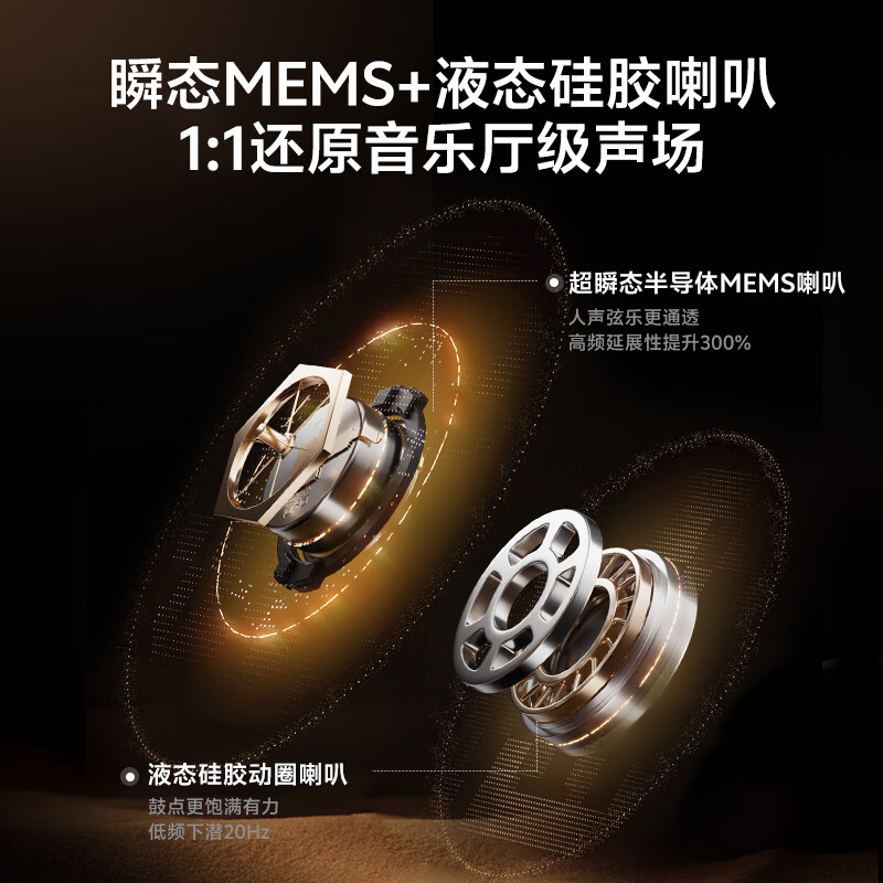 该耳机可选钛金色、午夜黑两款配色,搭载同轴双喇叭分频:超瞬态 MEMS 喇叭 + 10mm 液态硅胶喇叭,采用高低音出音孔分离设计结构,拥有无线 Hi-Res 金标认证,支持 96kHz/24bit LDAC,还搭载 HiFi 5 DSP 音频处理器。