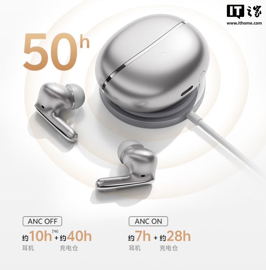 该耳机还配有 6 颗麦克风拾音、科大讯飞 AI 翻译;官方标称总续航达 50 小时,开启降噪总续航达 35 小时。
