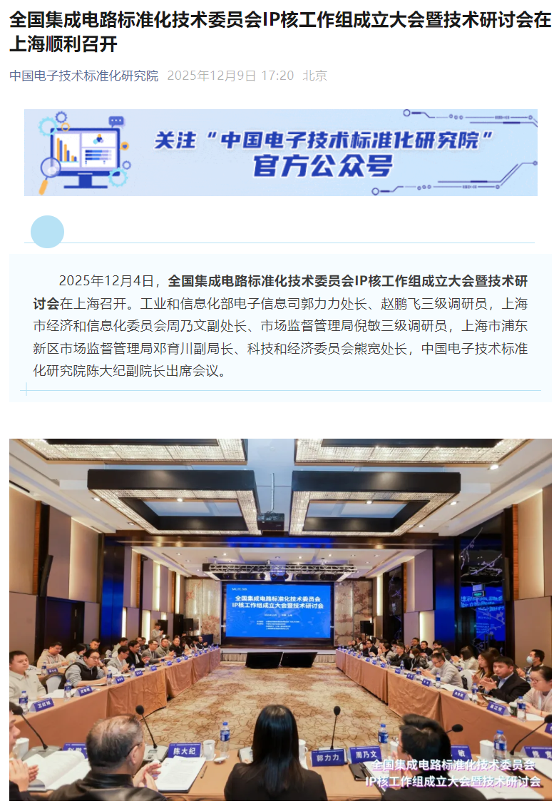 IT之家 12 月 9 日消息,据中国电子技术标准化研究院今日消息,2025 年 12 月 4 日,全国集成电路标准化技术委员会 IP 核工作组成立大会暨技术研讨会在上海召开。