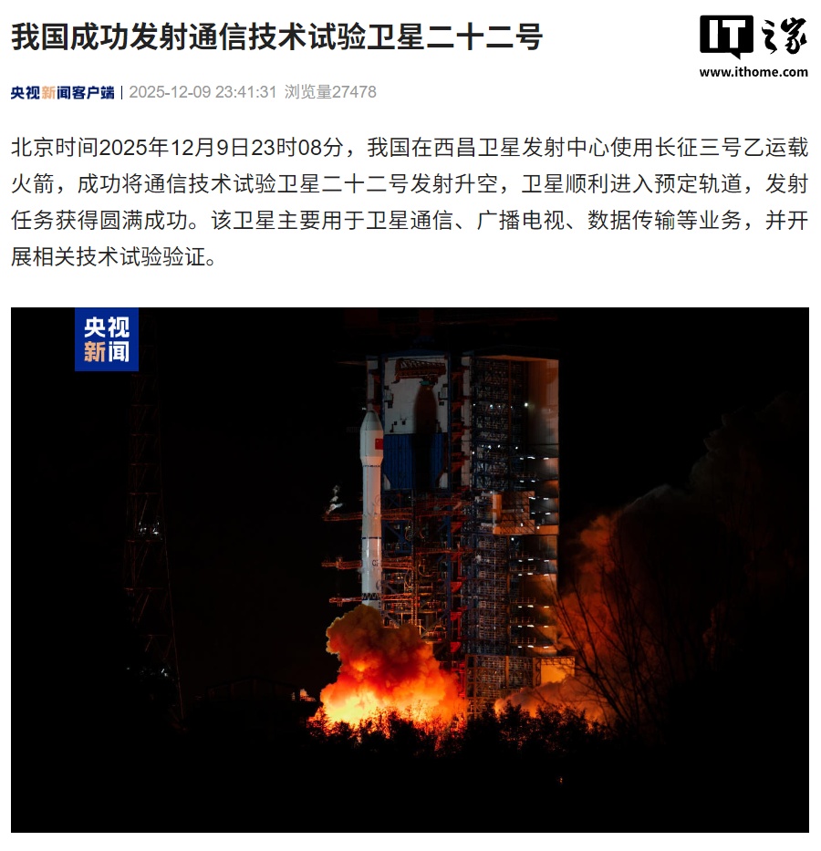 IT之家 12 月 9 日消息,据央视新闻报道,北京时间 2025 年 12 月 9 日 23 时 08 分,我国在西昌卫星发射中心使用长征三号乙运载火箭,成功将通信技术试验卫星二十二号发射升空,卫星顺利进入预定轨道,发射任务获得圆满成功。