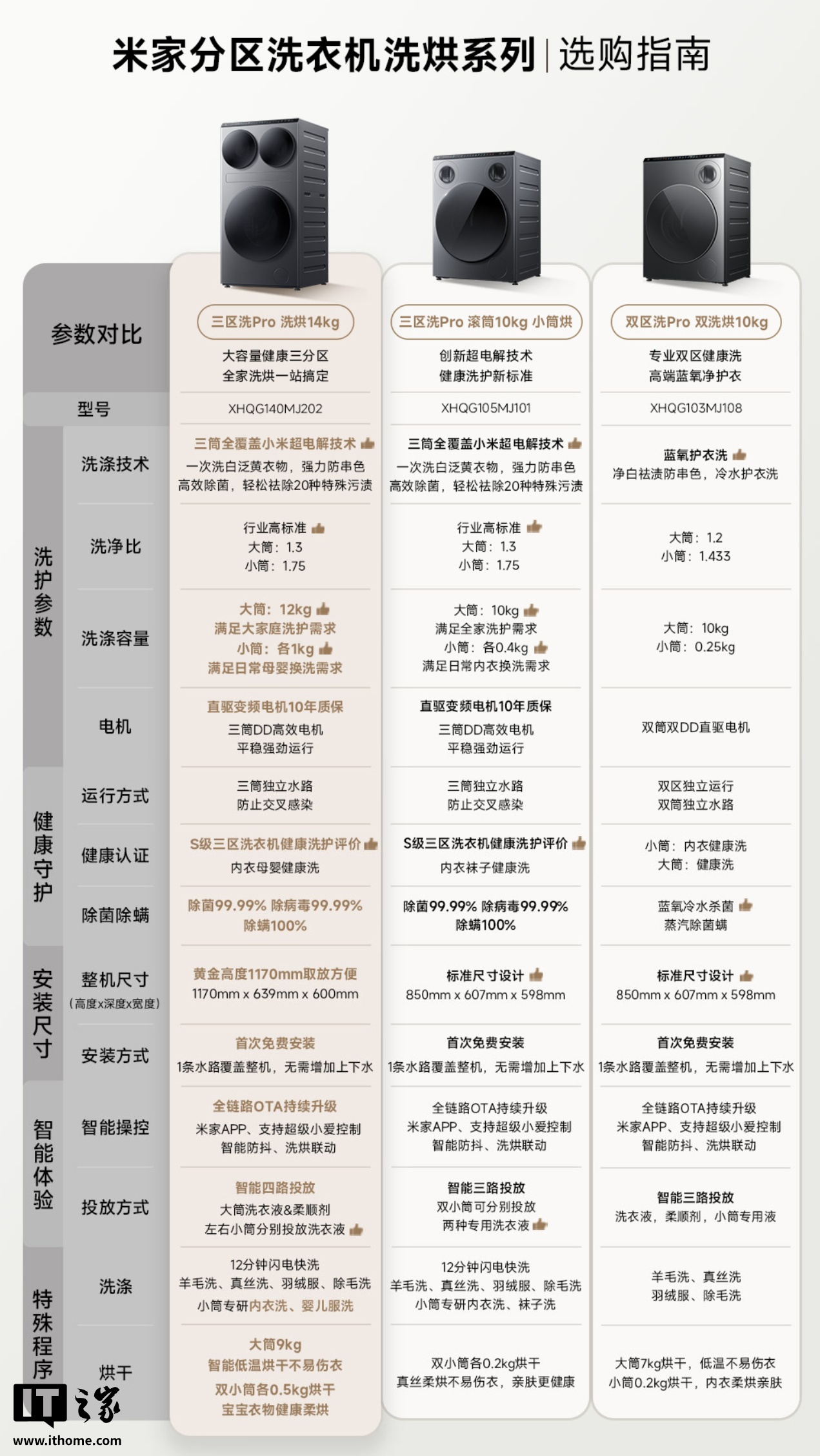 此外,洗烘 14kg 版本的大筒新增支持 9kg 烘干,小筒的烘干提升到 0.5kg。