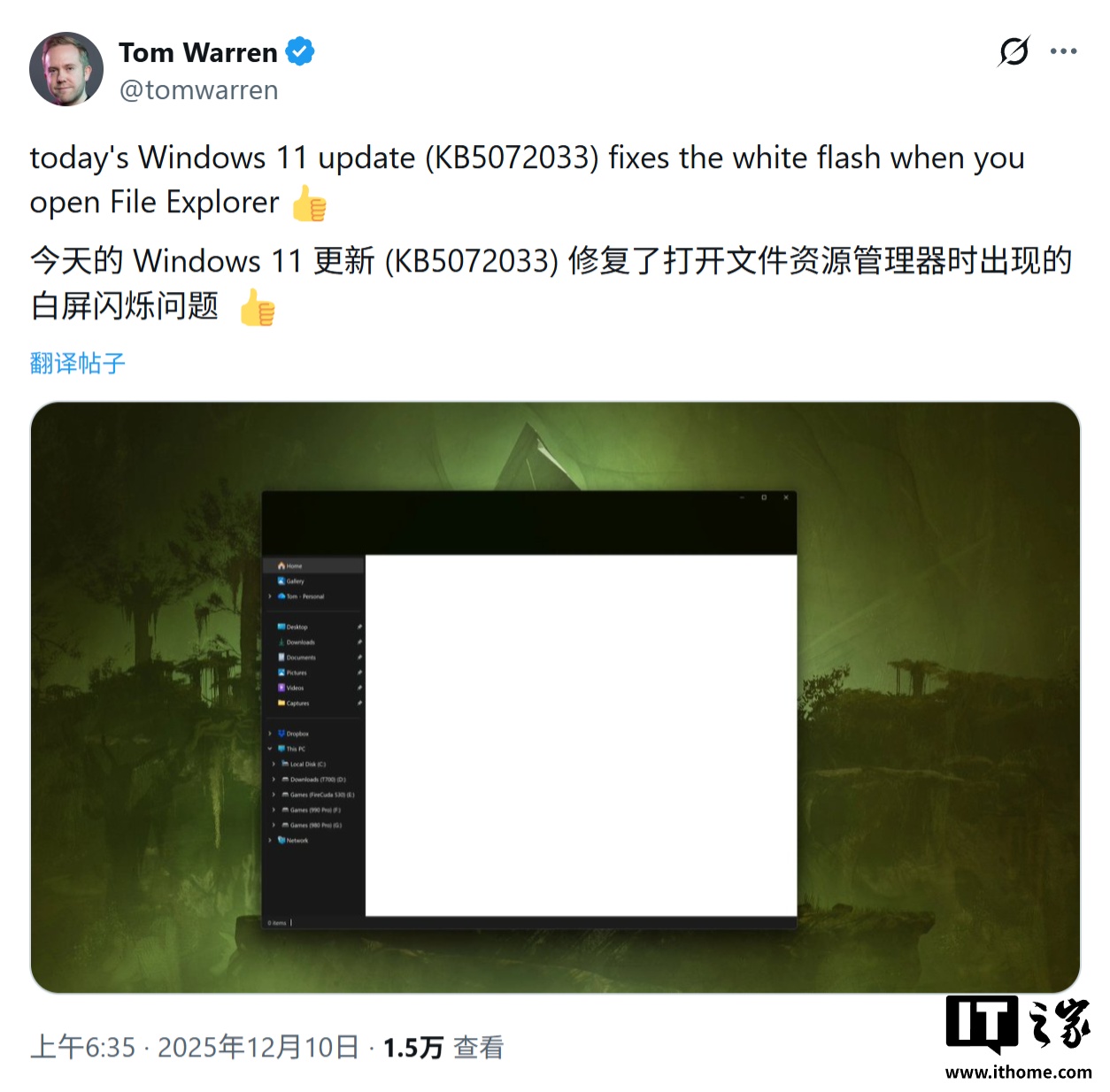 IT之家 12 月 10 日消息,科技媒体 Windows Latest 昨日(12 月 9 日)发布博文,报道称在 12 月补丁星期二活动日中,微软面向 Windows 11 24H2 和 25H2 系统,推送了 2025 年最后 1 个安全累积更新 KB5072033,用户安装后版本号升至 26100.7462 和 26200.7462。