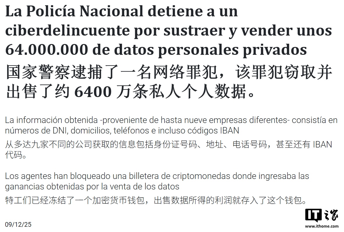 西班牙警方目前已对其提出网络犯罪、未经授权访问、泄露私人数据及侵犯隐私等多项指控,并扣押了其作案用的计算机设备以及包含非法所得的加密货币钱包。IT之家附上官方公告如下: