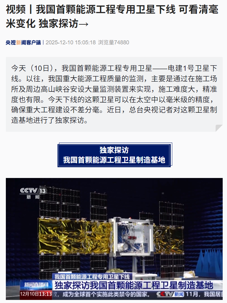 IT之家 12 月 10 日消息,据央视新闻报道,我国首颗能源工程专用卫星 —— 电建 1 号卫星于今日下线。