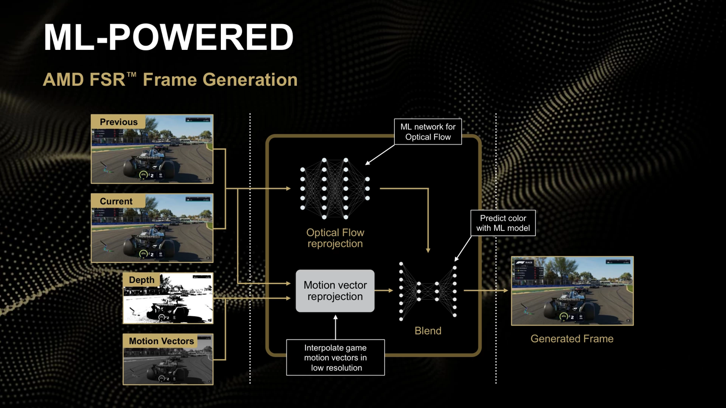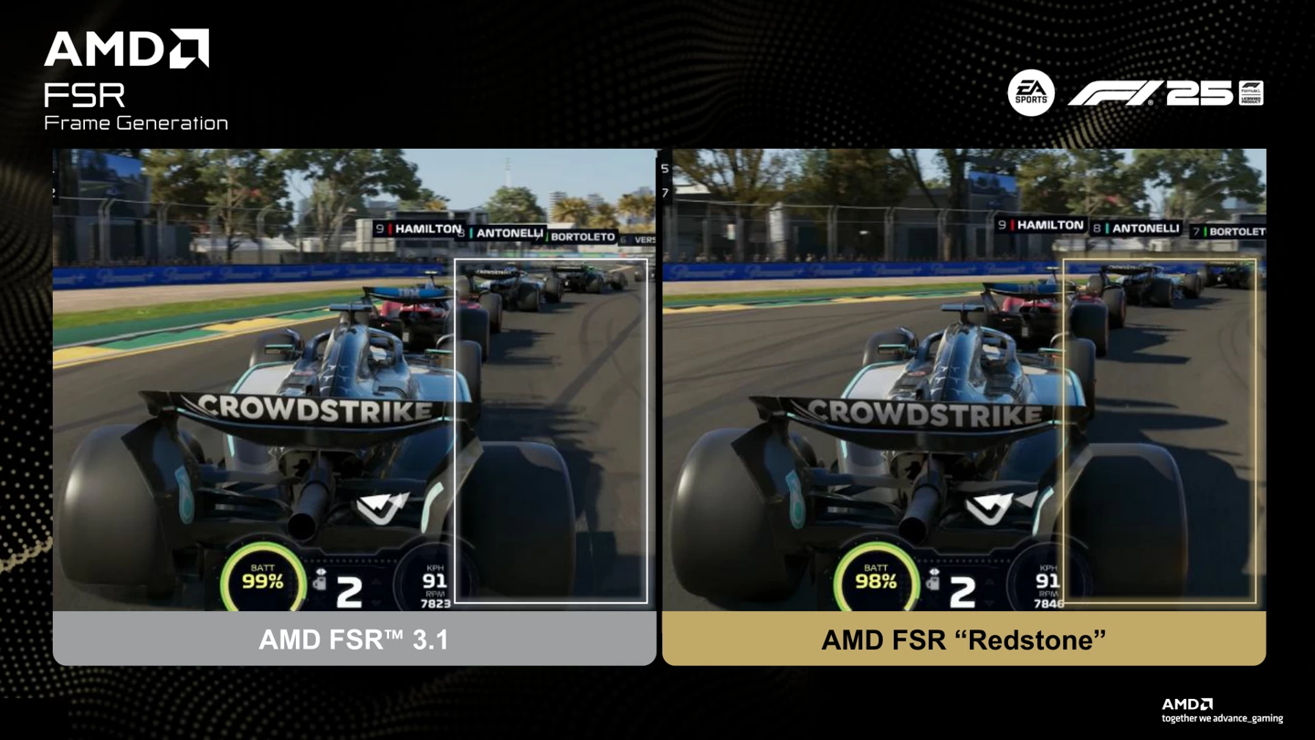 在帧生成方面,Redstone 引入更先进的 AI 处理架构,以取代此前并非基于 AI 插帧方式。AMD 以《F1 25》展示了画面生成质量上的明显提升。