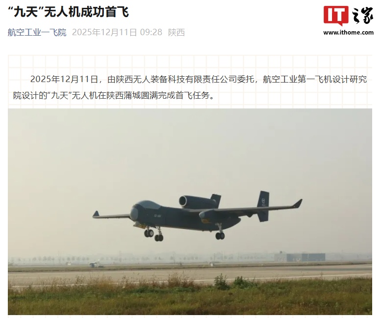 IT之家 12 月 11 日消息,据航空工业一飞院今日分享,2025 年 12 月 11 日,由陕西无人装备科技有限责任公司委托,航空工业第一飞机设计研究院设计的“九天”无人机在陕西蒲城圆满完成首飞任务。此次首飞成功标志着我国大型无人机技术实现新突破,其规模化应用将加速产业链与创新链的协同融合。