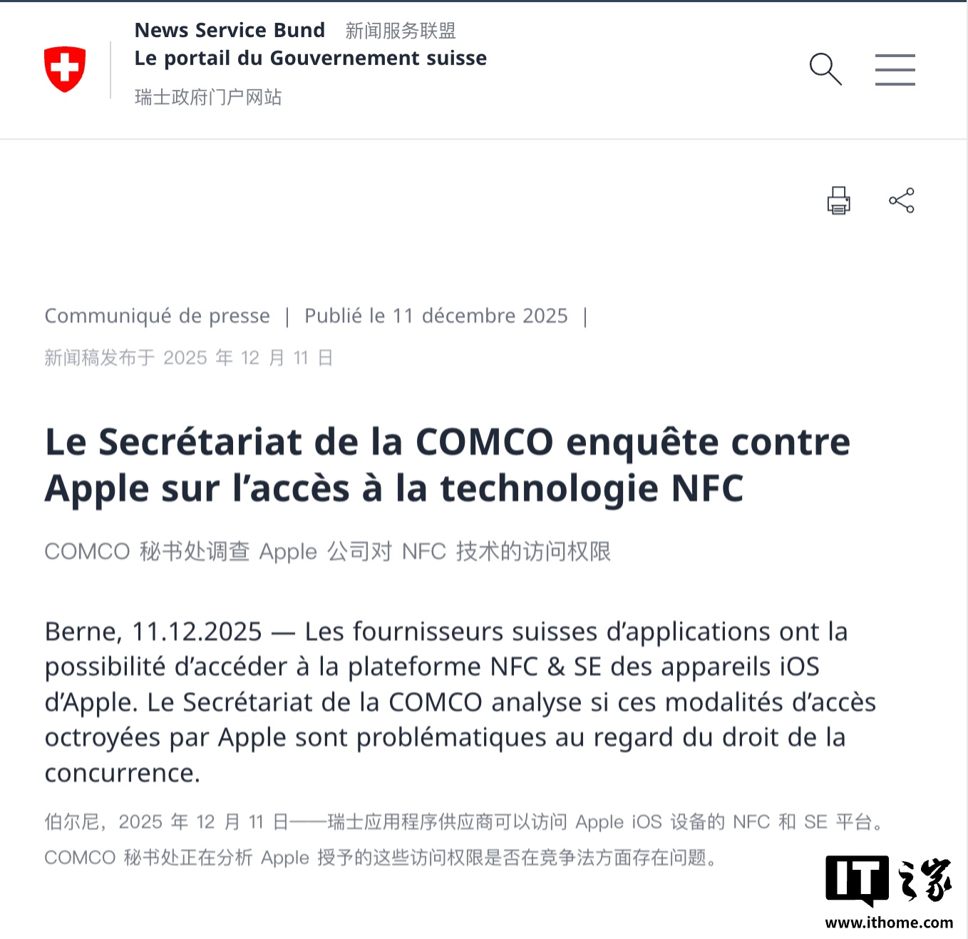 IT之家 12 月 11 日消息,瑞士竞争委员会(COMCO)今日通过瑞士政府门户网站公告:当地的应用供应商可以访问苹果 iOS 设备的 NFC 和 SE 平台,COMCO 秘书处正在分析苹果授予的这些访问权限是否在竞争法方面存在问题。