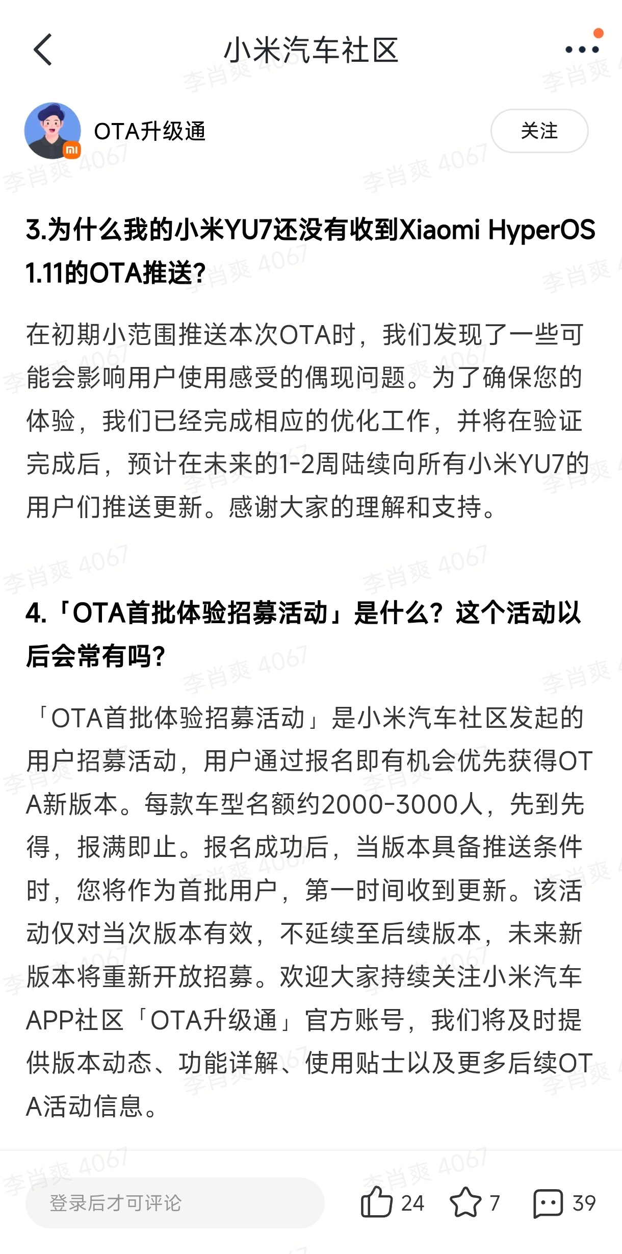 在初期小范围推送本次 OTA 时,我们发现了一些可能会影响用户使用感受的偶现问题。为了确保您的体验,我们已经完成相应的优化工作,并将在验证完成后,预计在未来的 1-2 周陆续向所有小米 YU7 的用户们推送更新。感谢大家的理解和支持。