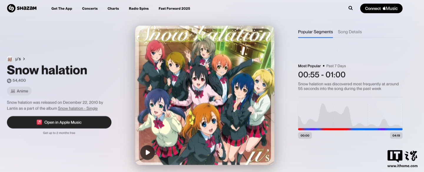 IT之家对此进行实测,该功能已在网页版 Shazam 中上线,以 μ's 的《Snow halation》为例,最近一个星期内大部分听众会在 55 秒至 1 分钟整时打开 Shazam 识别歌曲,同时 55 秒到 1 分钟 40 秒的热力值最高,显示大部分听众会直接跳转到这一部分。