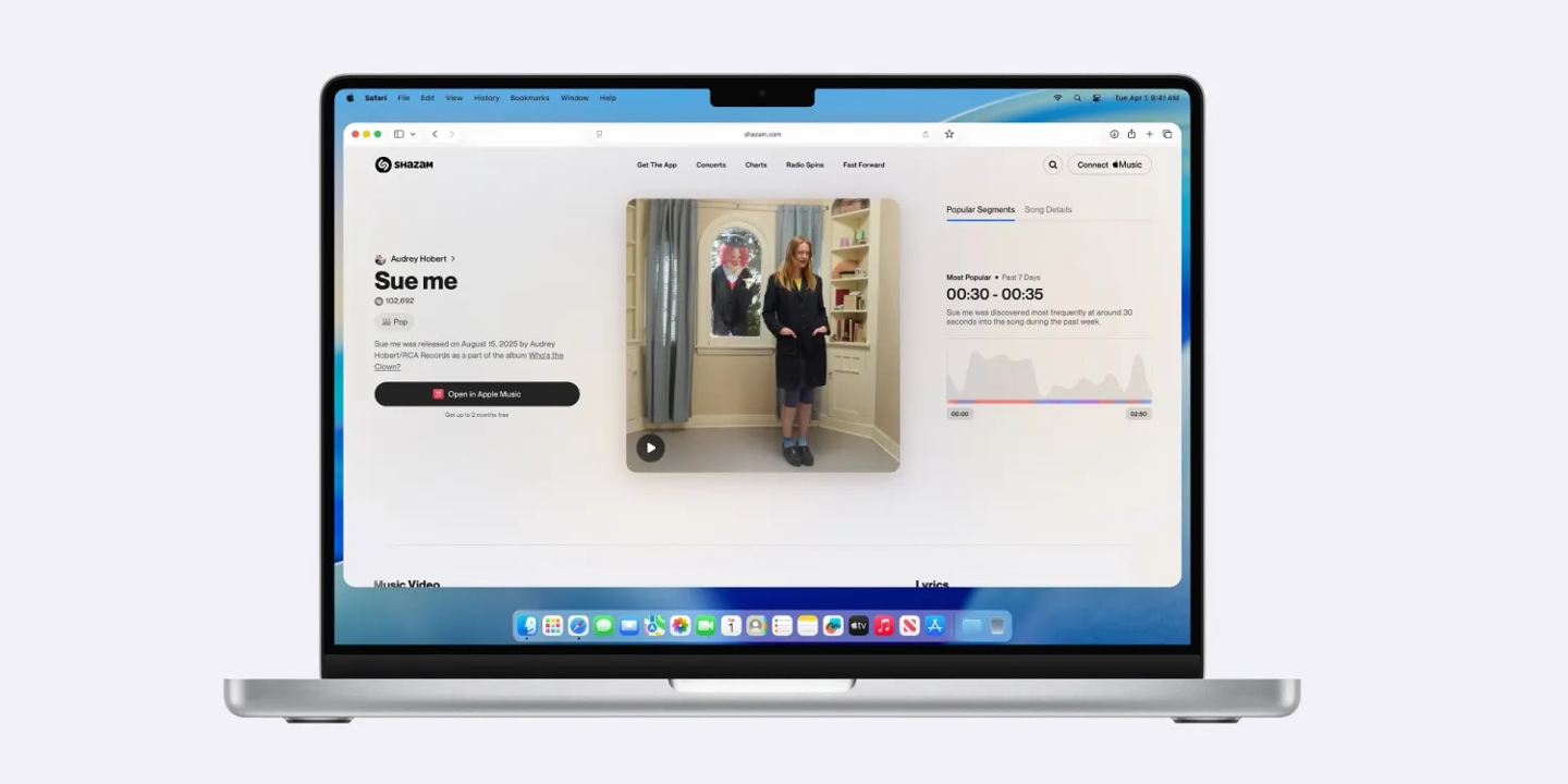 结合苹果官方新闻稿,这项功能可以展示用户在何时调用 Shazam 识别音乐,适用于 Shazam 音乐排行榜中的热门歌曲,还能够展示歌曲各个段落的受欢迎程度。