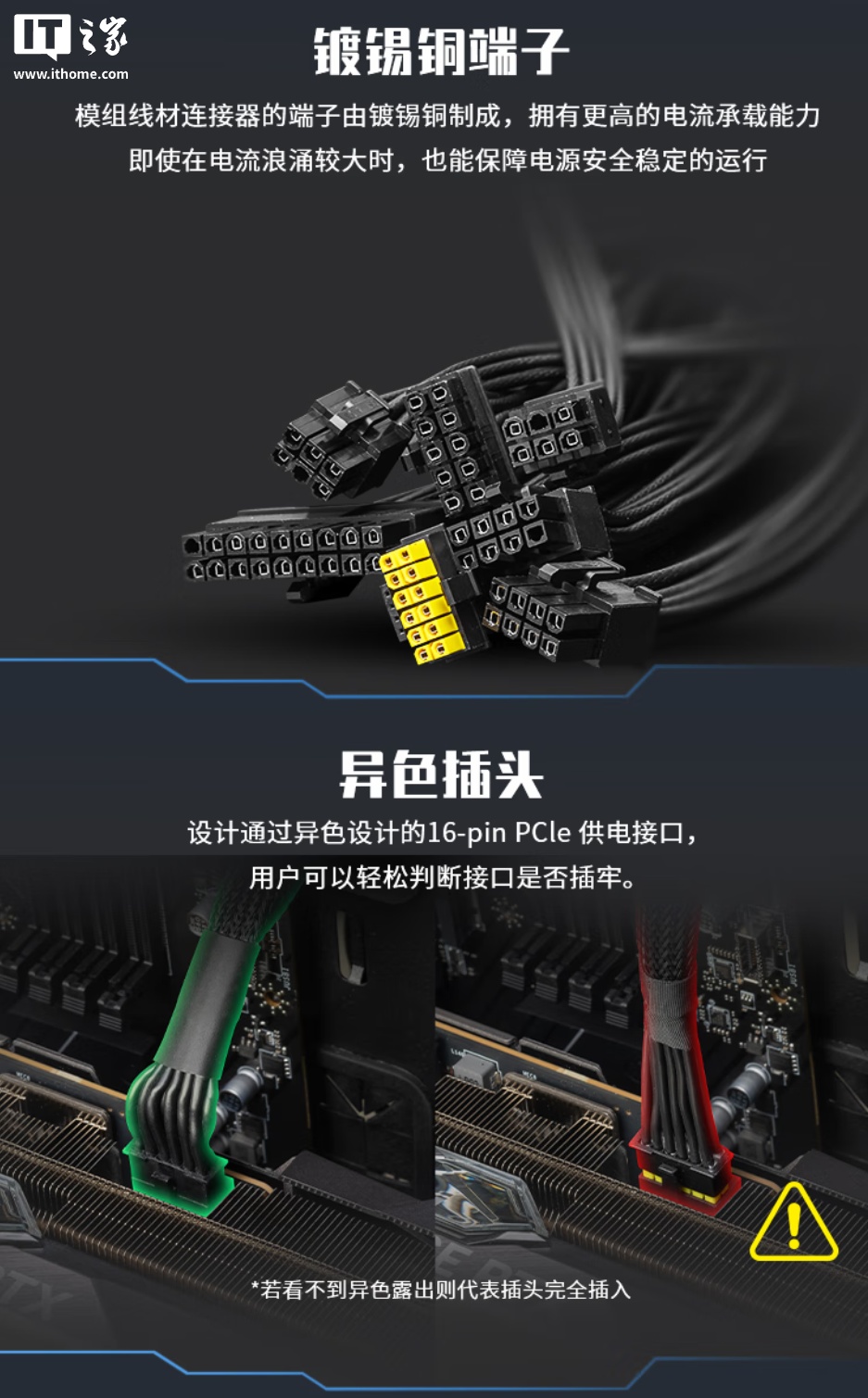 此外,这款电源的连接线端子由镀锡铜制成,拥有更高的电流承载能力,即使在电流浪涌较大时也能保障安全稳定运行,16pin 接口自带异色设计,用户可轻松判断接口是否插牢固,还拥有压纹设计,更易于弯曲,方便走线,使外观质感更高级。