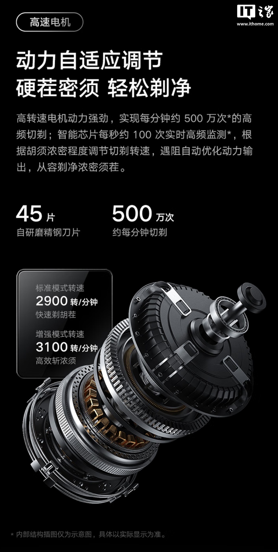 硬件方面,这款剃须刀自带高转速电机,可实现每分钟约 500 万次的高频切剃,自带智能芯片,实现每秒约 100 次实时高频检测,根据胡须浓密程度调节转速,刀架表面覆盖高密度硅基微珠,可形成顺滑水感涂层,缓解摩擦带来的紧绷和不适。