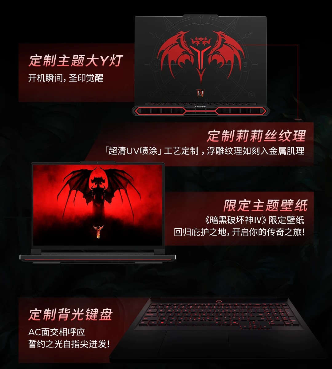 《暗黑 4》联名定制版 Y9000P 至尊版游戏笔记本电脑 A 面包含定制主题大 Y 灯和定制莉莉丝纹理,内置限定主题壁纸,还拥有定制背光键盘。
