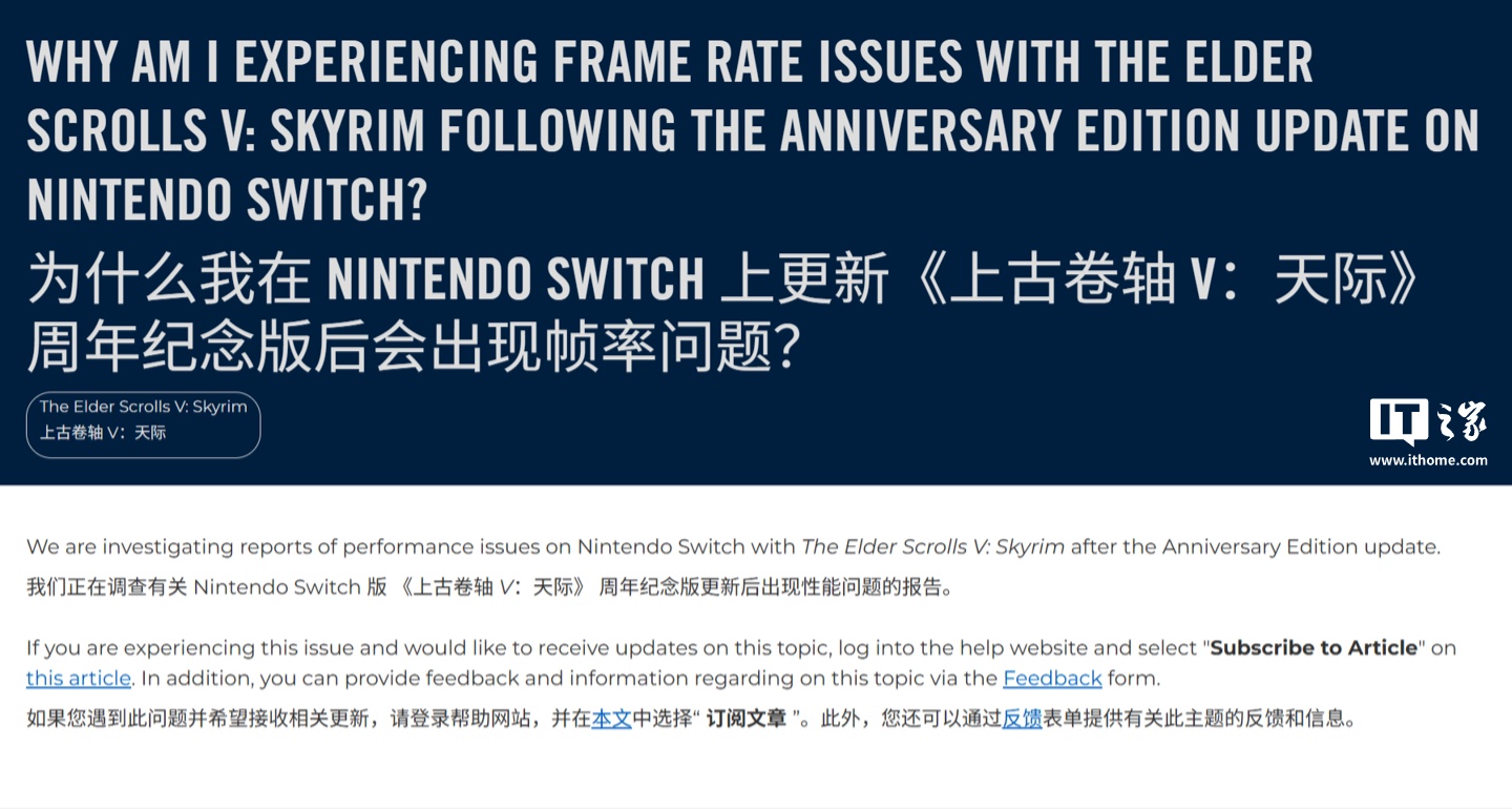 针对不断发酵的负面反馈,贝塞斯达已在其官方支持网站上做出回应。官方表示正在调查《周年纪念版》更新后在任天堂平台出现的性能报告,并呼吁遇到问题的玩家通过专门的 BUG 反馈页面提交详情。