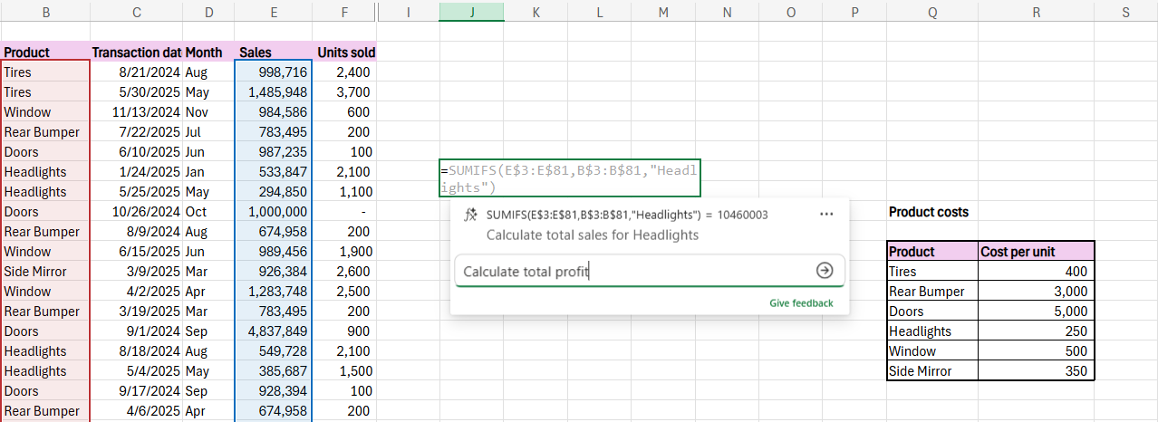 随后,用户仅需用大白话描述目标,例如“计算每位销售代表的总销量”或“筛选出唯一的销售人员名单”,Copilot 就会立即生成相应的公式。