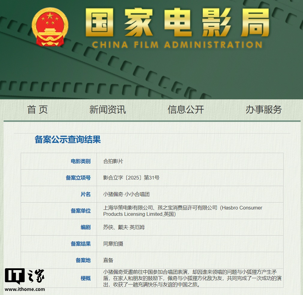 IT之家 12 月 12 日消息,据国家电影局昨日发布的关于 2025 年 11 月上全国电影剧本(梗概)备案、立项公示的通知,合拍片《小猪佩奇・小小合唱团》备案立项。