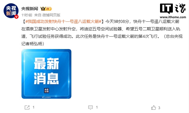 IT之家 12 月 13 日消息,今天上午 9 时 08 分,快舟十一号遥八运载火箭在酒泉卫星发射中心发射升空,将迪迩五号空间试验器、希望五号二期卫星顺利送入轨道,飞行试验任务获得成功。此次任务是快舟十一号运载火箭的第 4 次飞行!